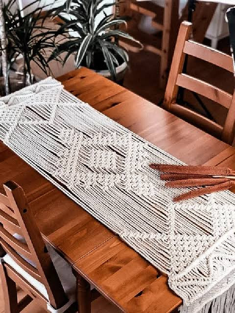 رانر مکرومه رومیزی بافته شده با نخ مکرومه تابیده رنگ شیری و ابعاد۳۰در۱۴۰