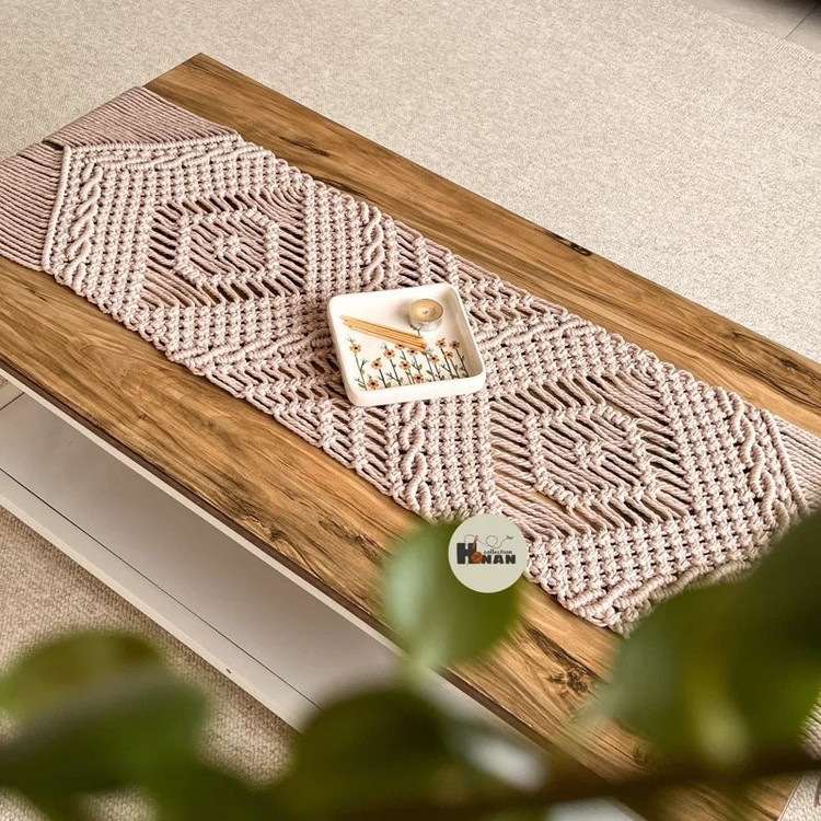 رانر مکرومه رومیزی بافته شده با نخ مکرومه تابیده رنگ شیری و ابعاد۳۰در۱۴۰